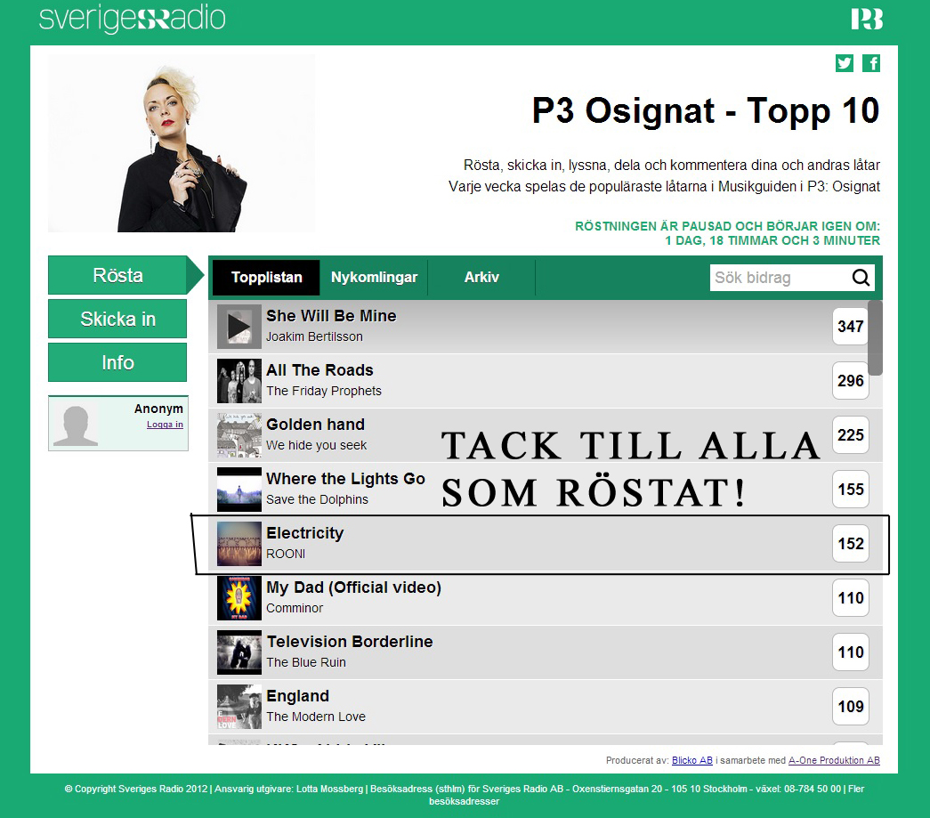 Posted on January 23, 2014 Tack för 5:e-platsen! Vi kom femma denna vecka, tack alla som röstat! Nu har vi maximalt två veckor kvar på listan, let´s köra så det ryker då! Share this: Share on X (Opens in new window) X Share on Facebook (Opens in new window) Facebook Like Loading... Related